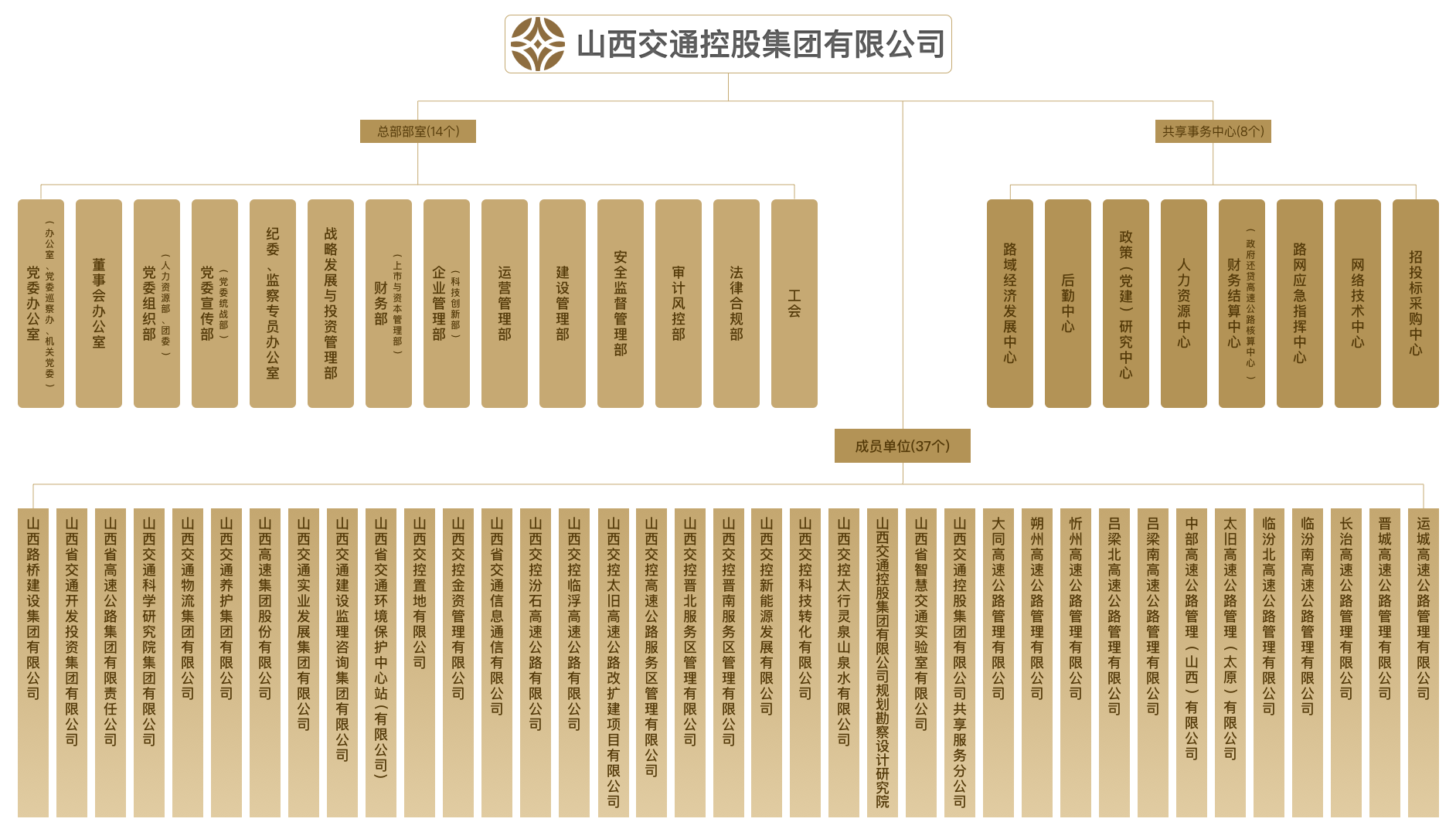 2017年11月24日正式挂牌, ,,,,,,,注册资金500亿元, ,,,,,,,资产总额超6300亿元, ,,,,,,,现有员工3.87万人, ,,,,,,,谋划管理收费公路6000公里(高速5750公里, ,,,,,,,一级250公里), ,,,,,,,占全省开通运营高速公路总里程93.3%。。 。。。拥有路桥集团、交投集团、交科集团等35个二级自力法人企业, ,,,,,,,其中1个A股控股上市公司(山西高速, ,,,,,,,000755.SZ)。。 。。。